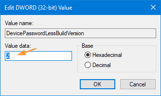 - In the Edit DWORD Value window, enter 2 into the Value data if you want to enable the passwordless sign-in feature for Microsoft account. To disable the passwordless login, just set its value to 0.
