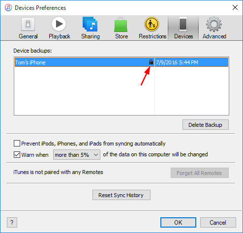- Once the Preferences window opens, click the Devices tab. If you spot a tiny lock icon in the row of your latest backup, it indicates your iTunes backup is encrypted successfully.