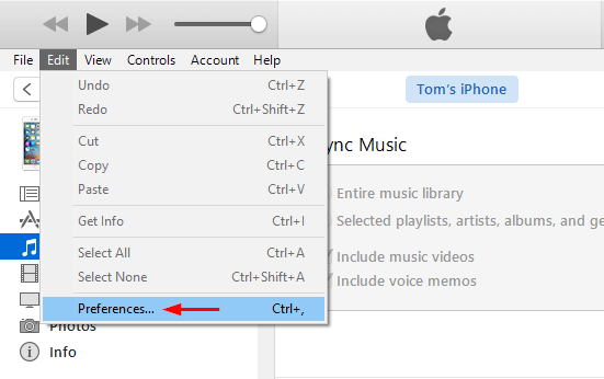 5. When it’s done, you can verify that your backup is encrypted. Within iTunes, click the Edit menu and select Preferences.