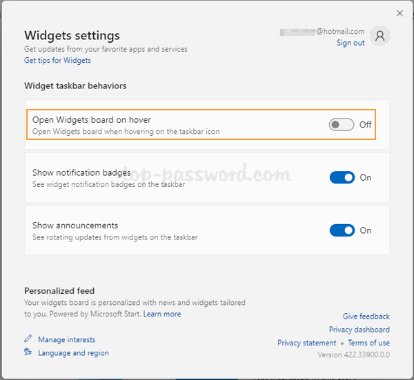 3. Turn off the “Open Widgets board on hover” toggle switch to prevent accidentally opening Widgets by hovering over the weather icon in the taskbar.