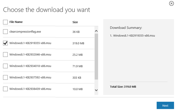 - Windows 8.1 Update contains six separate files: clearcompressionflag.exe, KB2919355, KB2932046, KB2934018, KB2937592 and KB2938439. You just need to select the file contains KB2919355 and click Next to begin downloading.