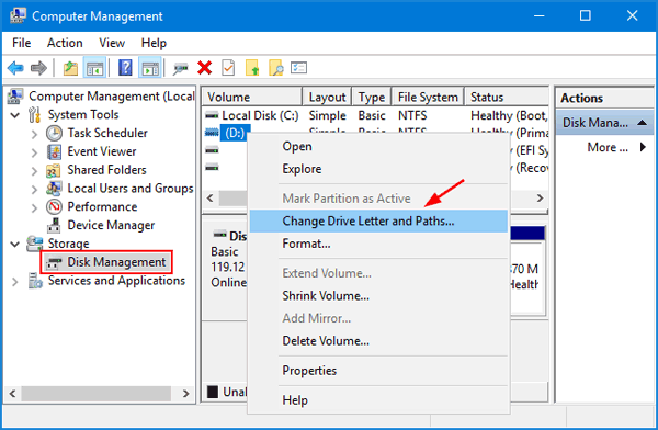 - Right-click the partition you want to remove drive letter, then select Change Drive Letter and Paths.
