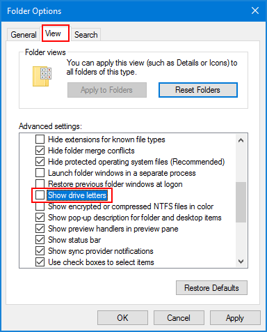 - In the Folder Options window, select the View tab. Under the Advanced settings, uncheck the “Show drive letters” option and click OK.