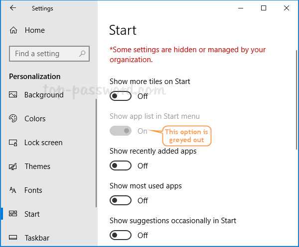 If you’ve chosen the “Remove and disable setting” option, it will also disable the “All apps” button so you have no option to access the apps list from the Start Menu.