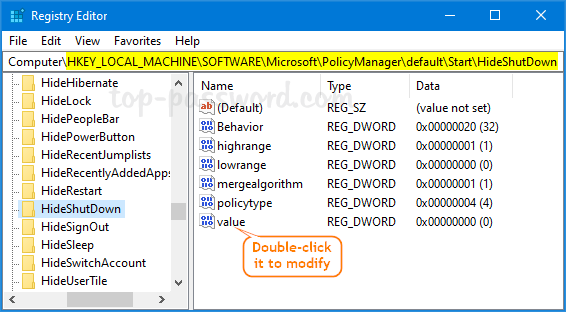 HKEY_LOCAL_MACHINE\SOFTWARE\Microsoft\PolicyManager\default\Start\HidePowerButton - Change the value data from 0 to 1, and click OK.