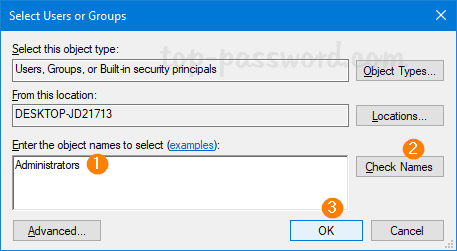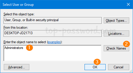 - Type Administrators in the “Enter the object names to select” text box, and click on Check Names button. If there is no error found, click OK.