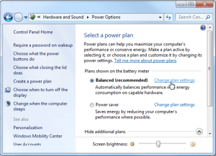 - Go to Control Panel –> Hardware and Sound –> Power Options.
