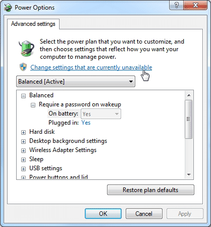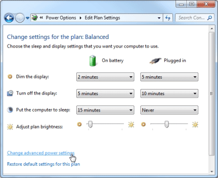 - Click the Change advanced power settings link. The Power Options dialog box is displayed.