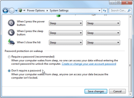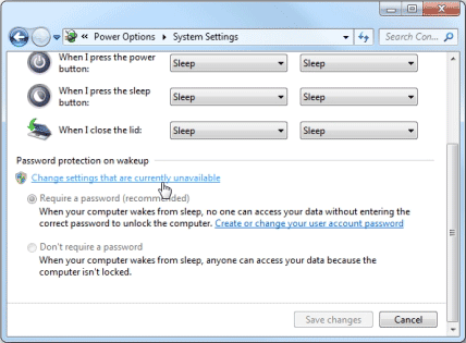 - Click the Change settings that are currently unavailable link under the Password protection on wakeup section. This will enable the two options below the link.