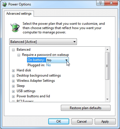 - Select No from the On battery drop-down list under the Require a password on wakeup node.
