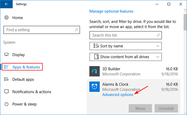 - On the left side of the window, click on Apps & features. You’ll see all the apps and programs you’ve installed on your computer. Find an app you want to reset, and click on it. Then click the “Advanced options” link under the app’s name.