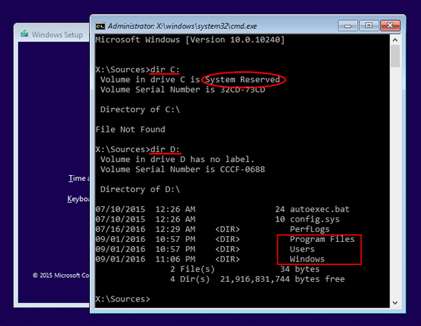 - At the Command Prompt, use the dir command to find the drive where your Windows is installed.