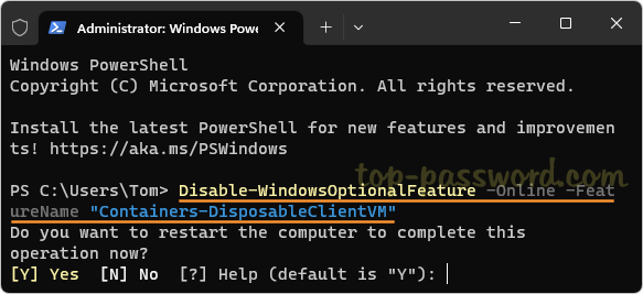 dism /online /Disable-Feature /FeatureName:"Containers-DisposableClientVM"