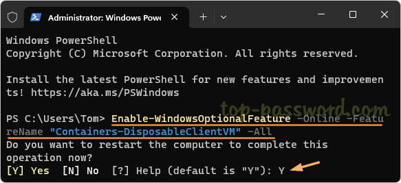 3. When prompted to restart your PC, type Y to proceed. After installing Windows Sandbox, you can use the Start menu to find the Windows Sandbox and run it with admin rights.
