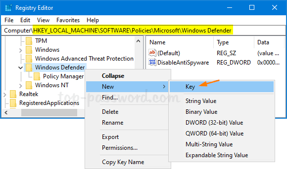 1. Open Registry Editor and navigate to: HKEY_LOCAL_MACHINE\SOFTWARE\Policies\Microsoft\Windows Defender. Right-click on the “Windows Defender” key and select New -> Key. Name it Scan.