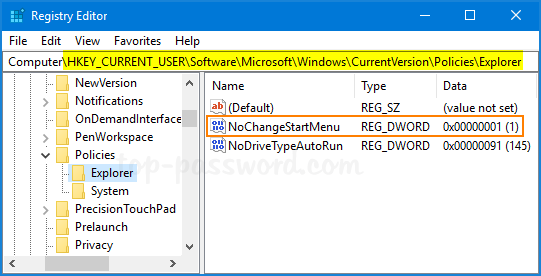 In left-side pane, right-click on Policies and select “New -> Key” and give it name Explorer. - Now right-click on the right-side pane, and then create a new 32-bit DWORD and name it NoChangeStartMenu, and set the value to 1.