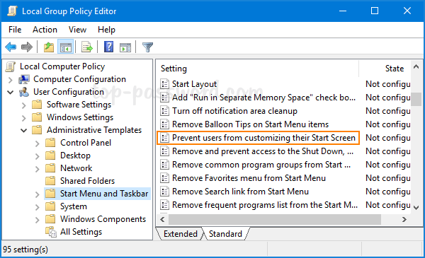 - Open the Local Group Policy Editor and go to: User Configuration -> Administrative Templates -> Start Menu and Taskbar. On the right-pane, double-click on the “Prevent users from customizing their Start Screen” policy to edit it.