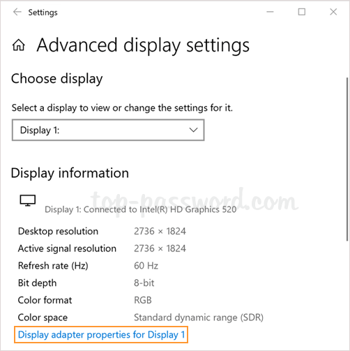 - On the next screen, click on the “Display adapter properties for Display 1” link.