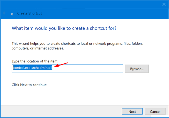 - When the Create Shortcut wizard opens, type control.exe srchadmin.dll in the location box and click Next.