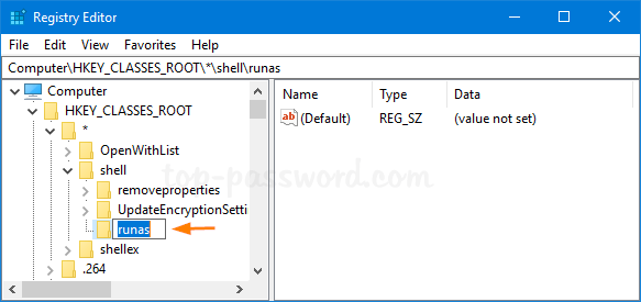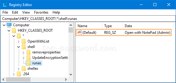 - Select the runas key, and then double-click on “(Default)” in the right pane and change its value to “Open with NotePad (Admin)“.