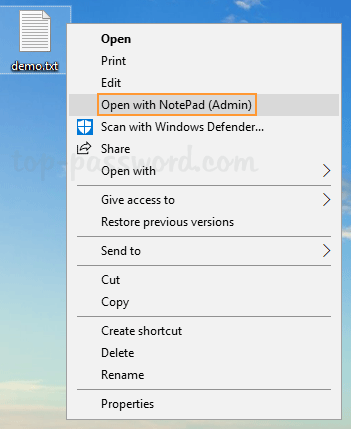 - Close Registry Editor. When you right-click any file in Windows Explorer, you’ll see a new option to open Notepad as admin from the context menu.