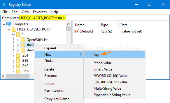 Right-click on the shell key in the left pane, and select New -> Key from the pop-up menu.