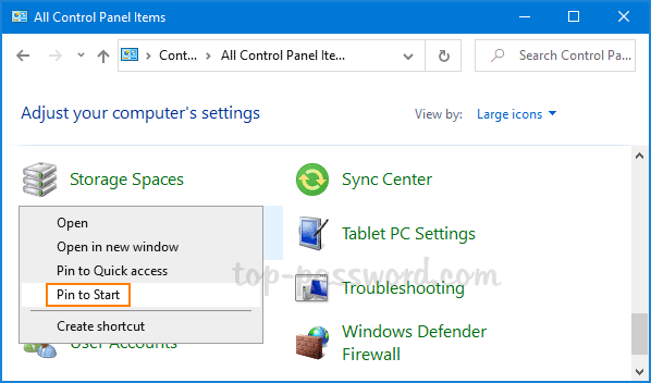 - Open the Control Panel and set the View by option to Large icons. Right-click on any specific item you want to pin on the Start Menu.