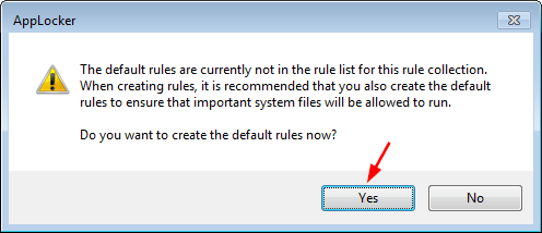 8. When prompted to create the default rules, make sure you click Yes. This is to ensure that the rules you created don’t block operating system files from running.