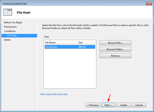 Here we’ll choose File hash because AppLocker can still identify the program even if it’s renamed or moved.