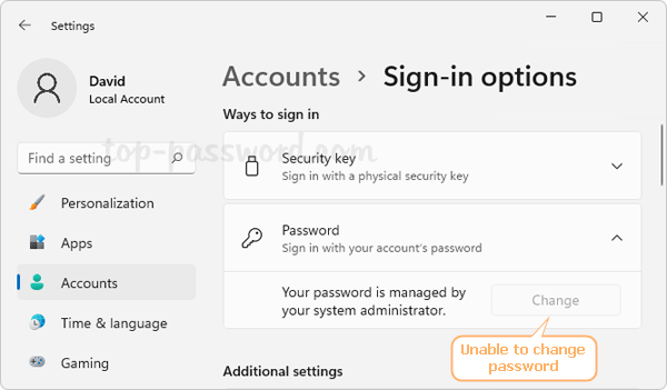 - When other people sign in to your PC with that standard account, open the Settings app and navigate to Accounts -> Sign-in options -> Password, they will find the Change button is greyed out.