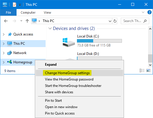 - Open File Explorer. Right-click the Homegroup shortcut in the left navigation pane, and then select “Change HomeGroup settings” from the pop-up menu.