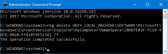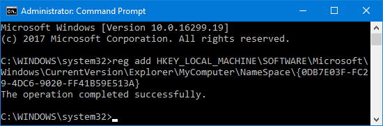 reg add HKEY_LOCAL_MACHINE\SOFTWARE\Microsoft\Windows\CurrentVersion\Explorer\MyComputer\NameSpace\{0DB7E03F-FC29-4DC6-9020-FF41B59E513A}