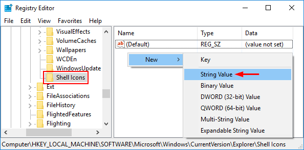 HKEY_LOCAL_MACHINE\SOFTWARE\Microsoft\Windows\CurrentVersion\Explorer\Shell IconsIf the Shell Icons key does not exist you’ll need to create it. To do so right-click the Explorer key in the left pane, then select New > Key and name it Shell Icons.