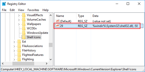 - In the right pane of the Shell Icons key, right-click on any empty area, and select New > String Value. Name it 29.