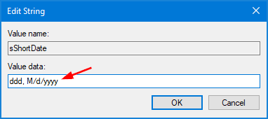 - In the Edit String window, Add the “ddd, ” string at the beginning of the Value data field and click OK.