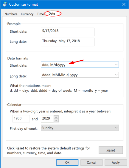 - Switch to the Date tab, and then add the “ddd, ” string at the beginning of the Short date field. Click OK and you’re done!