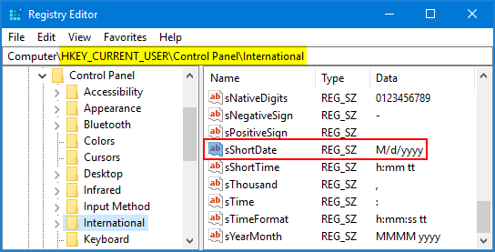 HKEY_CURRENT_USER\Control Panel\International - Double-click the sShortDate entry in the right side of the Registry Editor window.