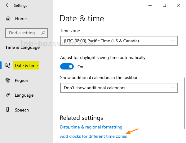 - Select the Date & time tab. Scroll down to the “Related settings” section and click on “Add clocks for different time zones“.