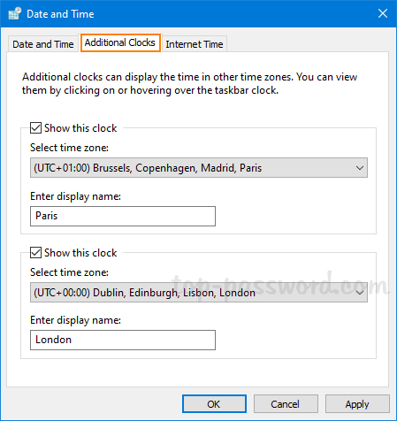 - Under the “Additional Clocks” tab, check the “Show this clock” box, choose the time zone you want and give it a name. Note that you can add up to two additional time zone clocks.