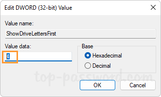 3. A small window will pop up. Enter 4 in the Value data box to make Windows show all drive letters before drive labels, and click OK.