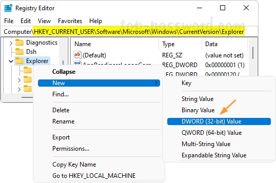 1. Open Registry Editor and navigate to: HKEY_CURRENT_USER\SOFTWARE\Microsoft\Windows\CurrentVersion\Explorer. Right-click the Explorer key in the left pane, then choose New > DWORD (32-bit) Value.