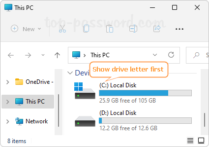 How can I make the drive letter appear before drive label in File Explorer? By default, File Explorer puts drive letters after drive names when listing the drives on the computer.