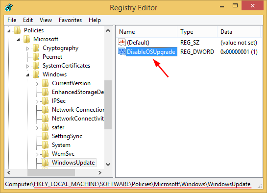 - Right-click in the right pane and create a new DWORD (32-bit) value named DisableOSUpgrade. Double-click the DisableOSUpgrade and enter a value of 1.