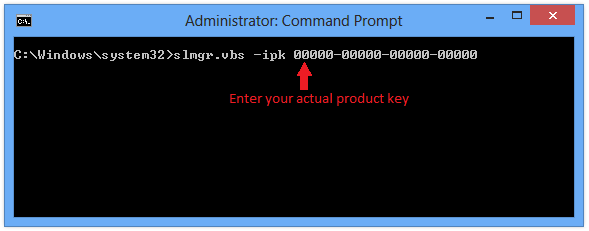 - Once the command prompt is launched with administrator privilege, run the following command to enter your product key: