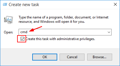 Type cmd in the Open box, and click OK to open up a regular Command Prompt. You can also check the “Create this task with administrative privileges” box to open the Command Prompt as administrator.