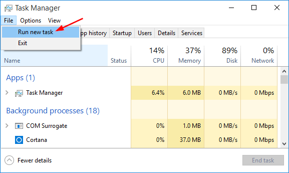 Open Task Manager with more details. Click on the File and then select Run new task.