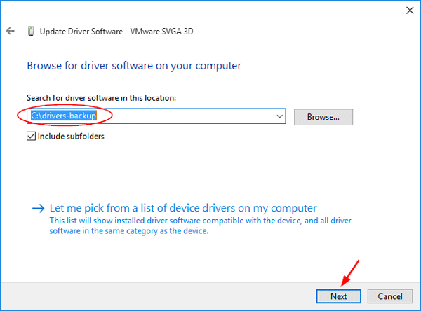 - Click on Browse to find the location of the driver files you backed up previously and click Next. Make sure the “Include subfolders” option is checked.