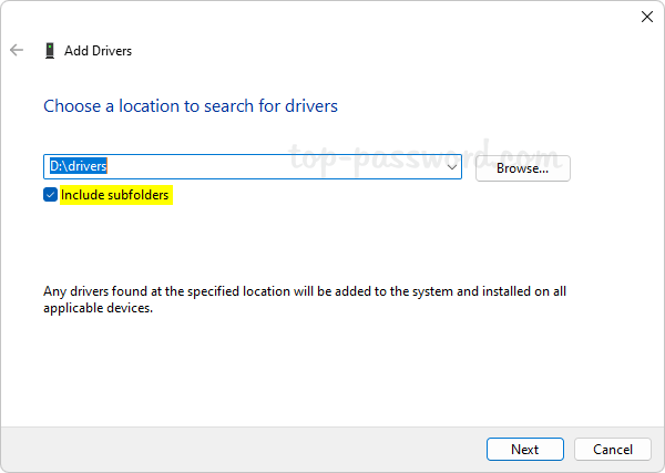 - Click on Browse to select the location where you’ve backed up the device drivers, tick the “Include subfolders” checkbox and click Next.