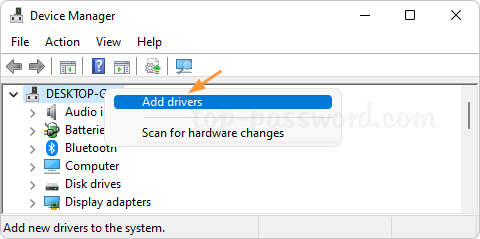 - Right-click your computer’s name at the top of the device list, and choose Add drivers.