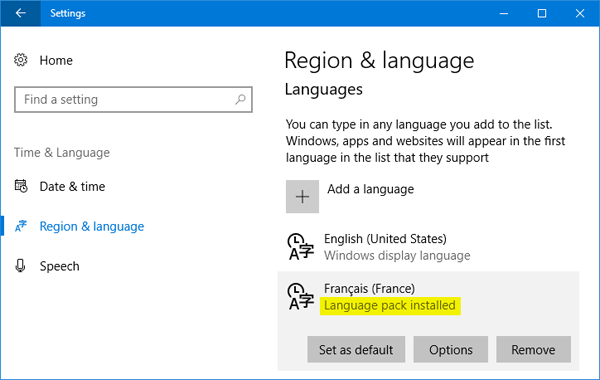 - The language that you selected is now added to the list of input languages for your keyboard. If you want to use the new language to display the user interface of Windows 10, click the Options link.